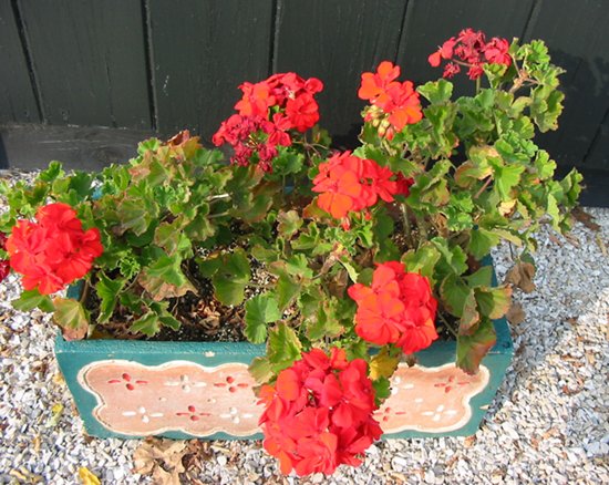 In small spaces needing a little color against a black or other plain backdrop, this small planter works well, with the color contrast to the red geraniums important.