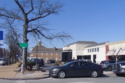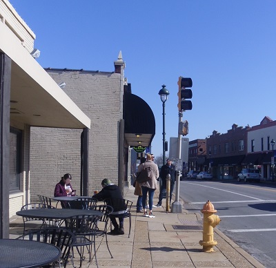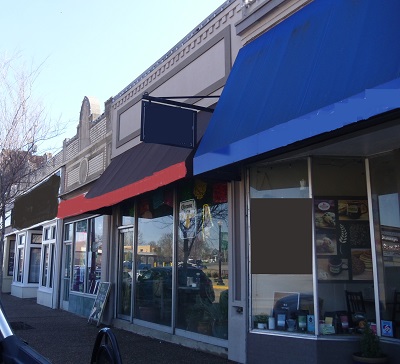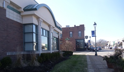Above: Notice the suburban-style setback with parking in front of the off-white building in the foreground. Behind the photographer and past the otherwise lovely off-white building, building setbacks are more typical of an historic shopping district. Convenient parking does not always have to equal parking in front of the building. A zoning ordinance requirement for building to the sidewalk in the event of redevelopment would be wise.