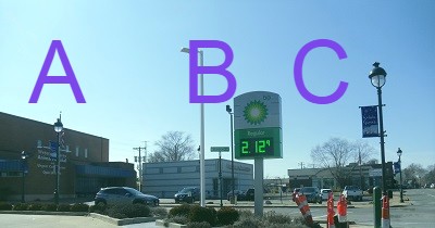 Above: Check out the dramatically different setbacks of buildings A, B, and C, each of which ideally would be aligned with the edge of the sidewalk where the photographer is standing. Notice the compounding assault on urban design of the gas station sign in the foreground. Zoning and various other guidelines could prevent new construction from repeating these mistakes. To correct situations such as this, the zoning ordinance needs to specify maximum setbacks (we recommend zero where possible) instead of or in addition to minimum setbacks. If your commercial block looks like this already, it probably won't be any more jarring if you require the correct setback for any new construction.