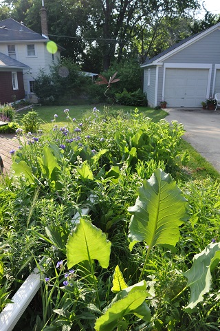 This downspout diverts almost all of the water falling on one side of a roof into a rain gardenBecause we have disrupted the water cycle with so many impermeable surfaces, most of our small creeks, streams, and wetlands dry up in the summer. This does not bode well for the fish, mussels, salamanders, invertebrates, and all the food chains that bind life together in those waterways. By putting water back into the ground, we can help keep these fragile systems alive so that kids can chase frogs, gather insects, and connect to nature.